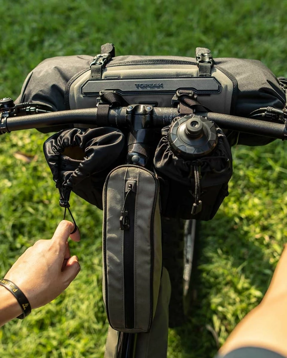 La petite dernière de la famille bikepacking de Topeak, la Freeloader, permet d’ajouter une solution de rangement supplémentaire directement accessible sur votre guidon.