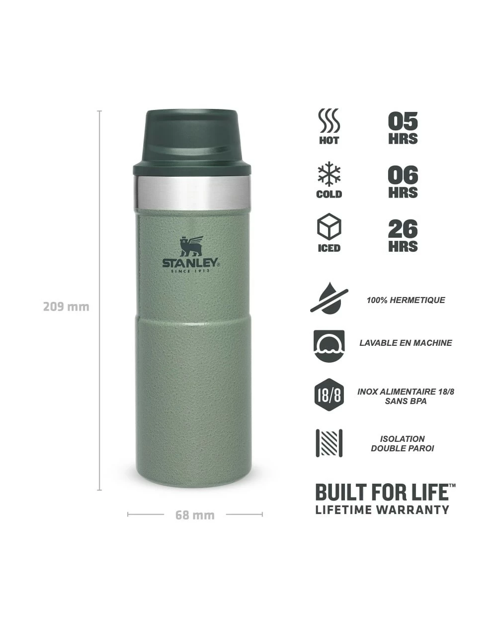 Construit en acier inoxydable 18/8 alimentaire, le mug/thermos est indestructible. Si bien qu’il est garanti à vie comme tous les produits Stanley. C’est pas pour rien qu’on les retrouve dans la boite à repas des bucherons nord américains.