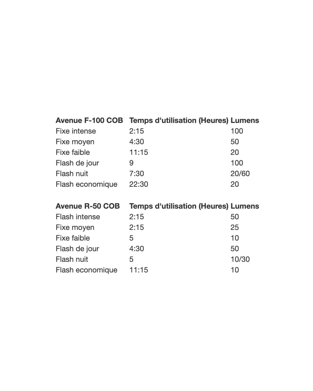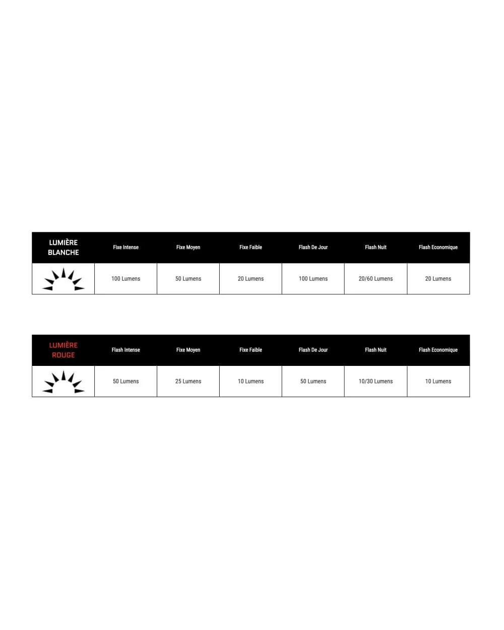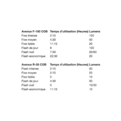 La lampe avant est le modèle F100 COB pour 100 lumens de puissance. Elle vous offrira jusqu’à 22h d’autonomie selon le mode utilisé. Il y a d’ailleurs de nombreux modes pour gérer votre autonomie ou choisir selon votre trajet (continu, plein puissance, moyenne, faible, clignotement …).