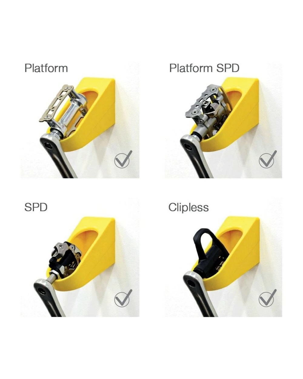Votre vélo est alors fixé par la pédale et repose sur 2 petits supports qui permettent de stabiliser l’ensemble et surtout de ne pas salir votre mur avec vos roues.